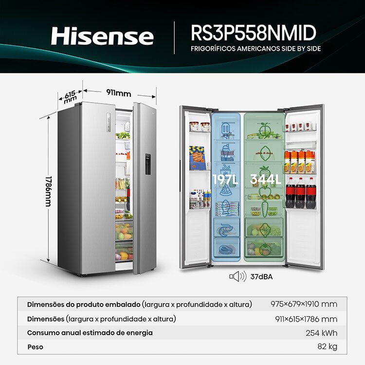 €1199,99FRIGORÍFICO AMERICANO HISENSE RS3P558NMID (No Frost, 541 Lt, Dispensador Água, Dispensador Gelo, Look Inox)